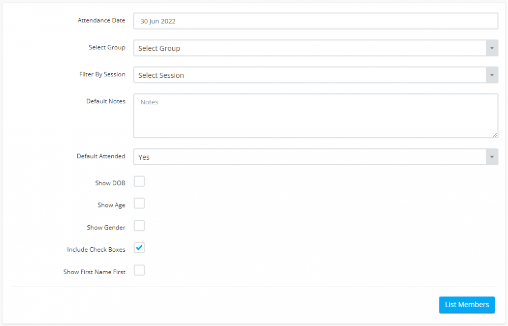 Enter the attendance date and the group and click "List Members". All members assigned to that group will be listed.