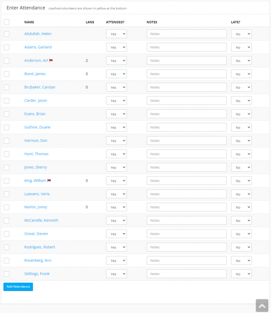 Select the relevant "Attended" option for each member and click the check box then click "Add Attendance".