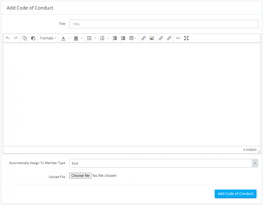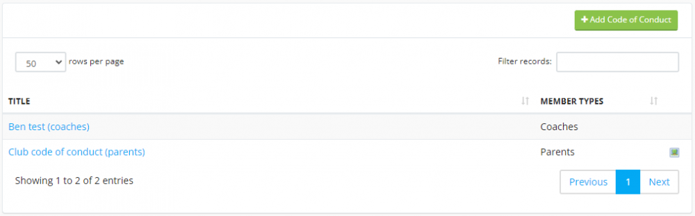 The code of conduct section allows you to make your members agree to one or more club code of conduct documents.