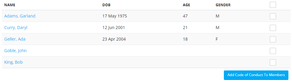 To add a code of conduct to your members in bulk, click on the title to view it, then click the "Add Code of Conduct To Members" button.