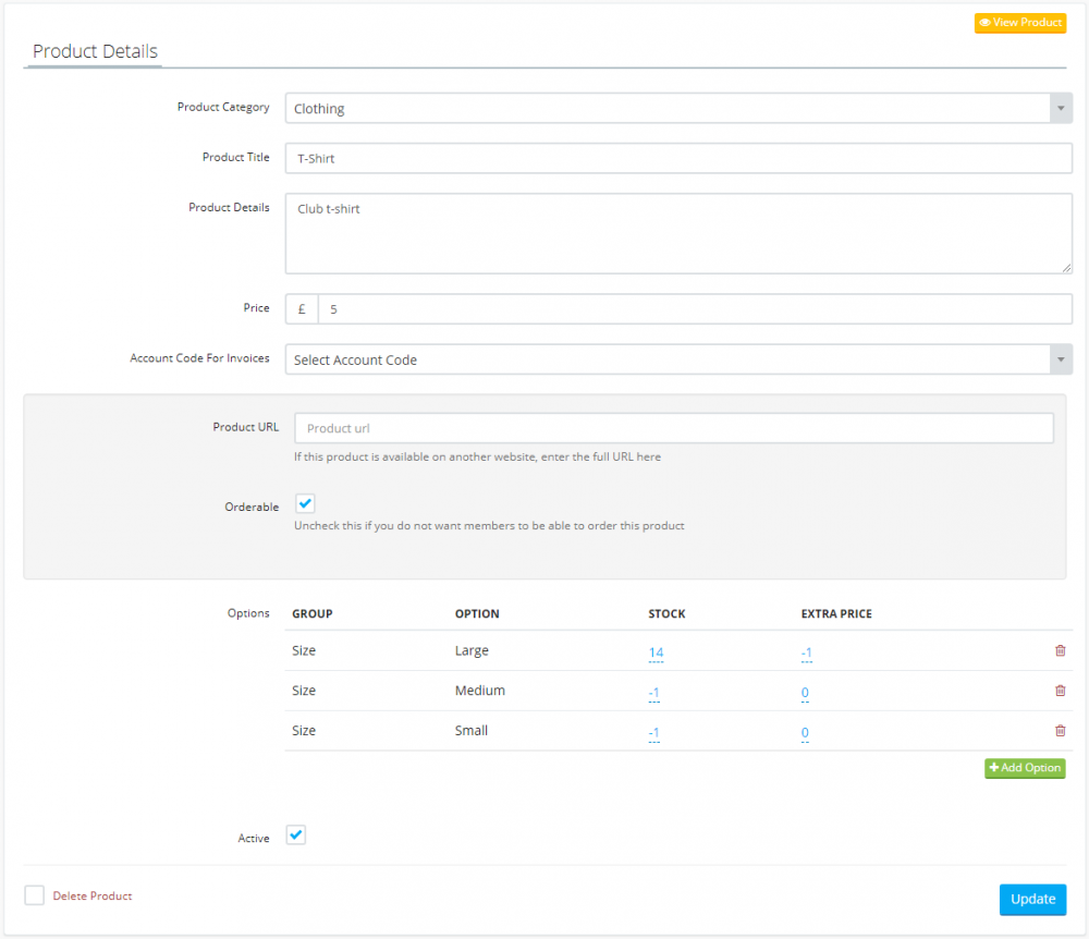 Product options are attributes such as size and colour. To add an option, click on the "Add Option" button. Select the option group then select the relevant options that apply to the product.