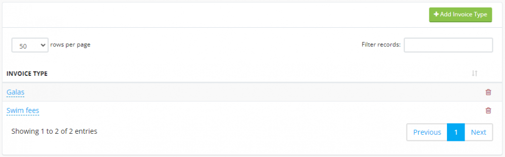 Invoice types are used to group invoices together, for example, gala fees, club kit etc etc.