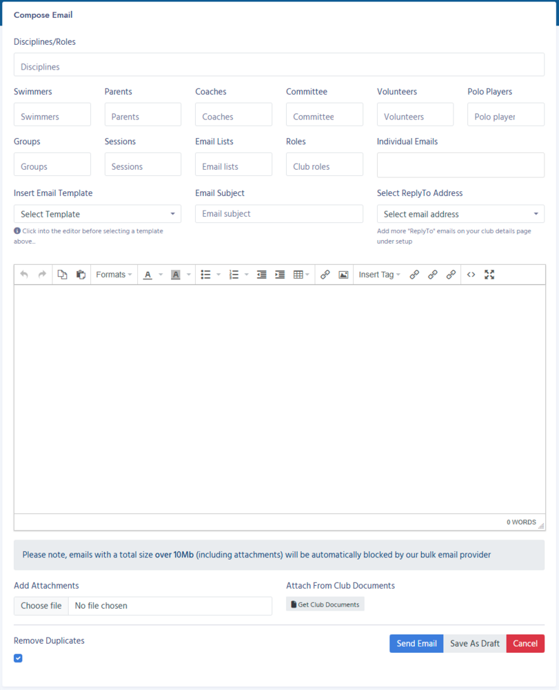 Any emails that are over 10Mb in size WILL NOT be sent. This is a limit that the service we use to send bulk emails imposes and unfortunately we have no control over it.