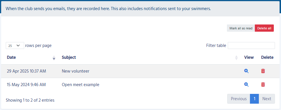 Each time someone sends you an email via the system, it is logged here. Click on the view icon to view the email.