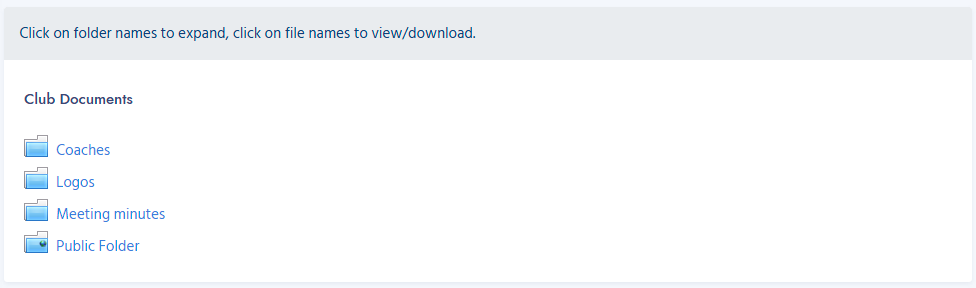 Below the notifications are your club documents. Click on the folders to open them and the filenames to view/download.
